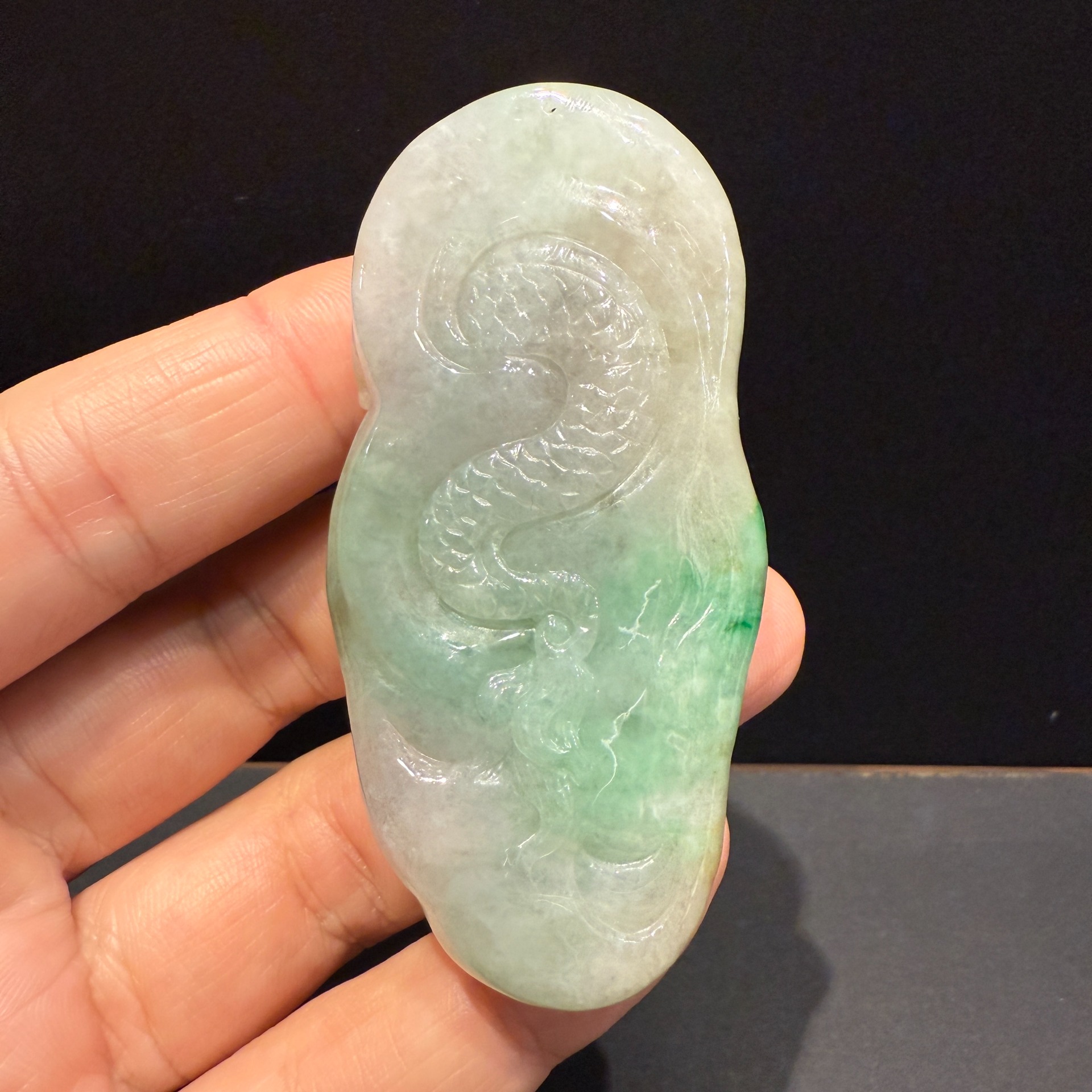 冰糯白地乾淨柔和,翠色自然散落在雲氣與龍身之間,呈現蓄勢而起的氣感。