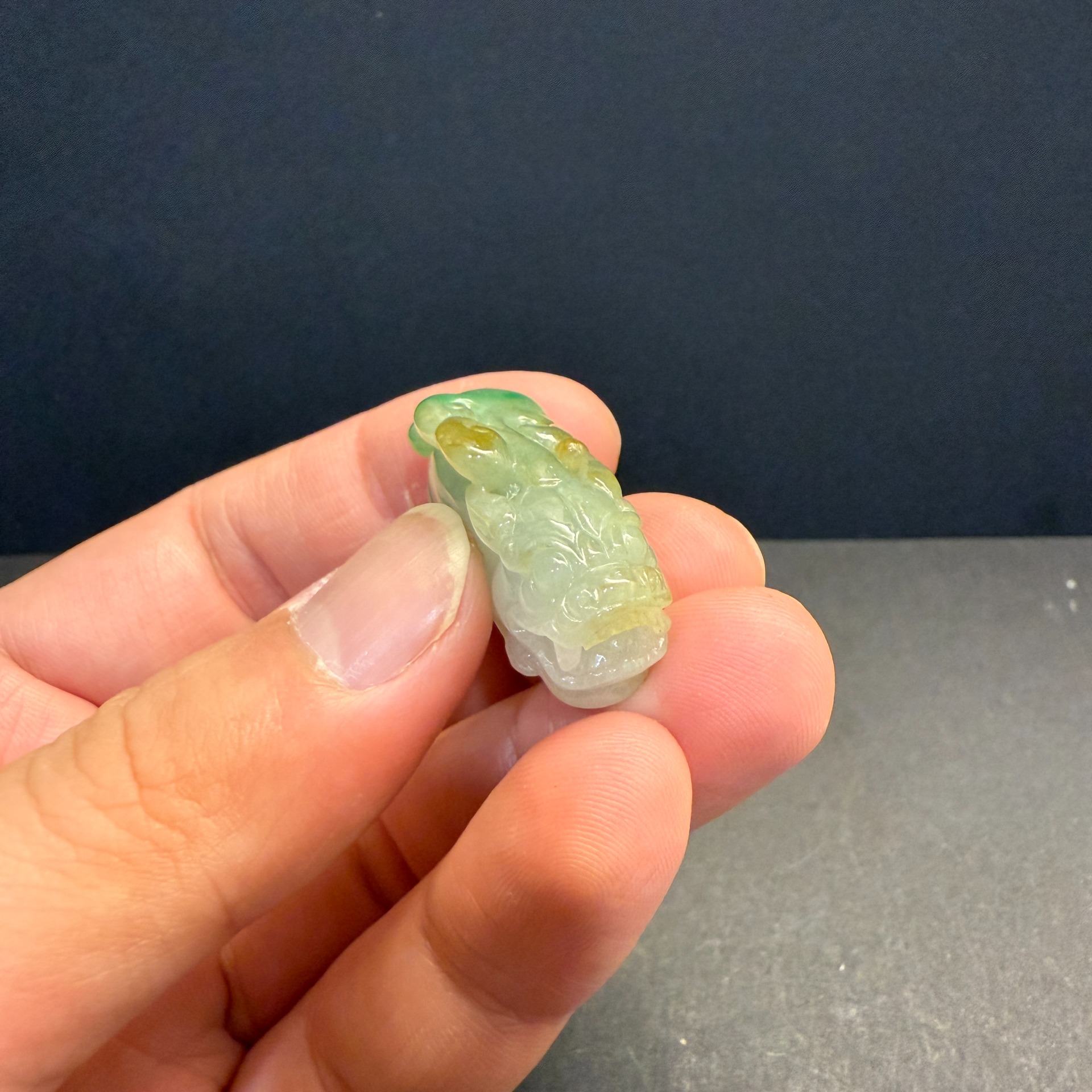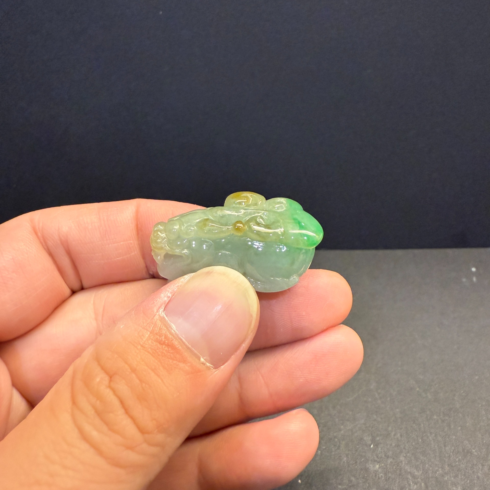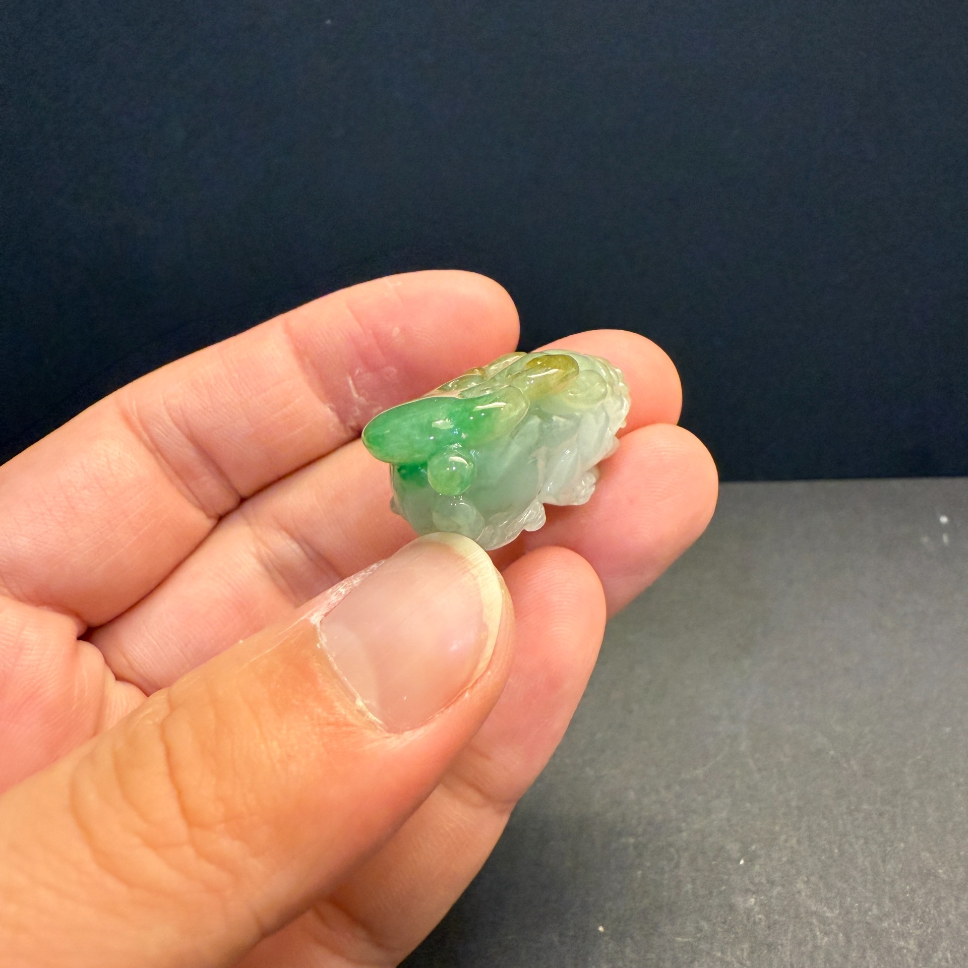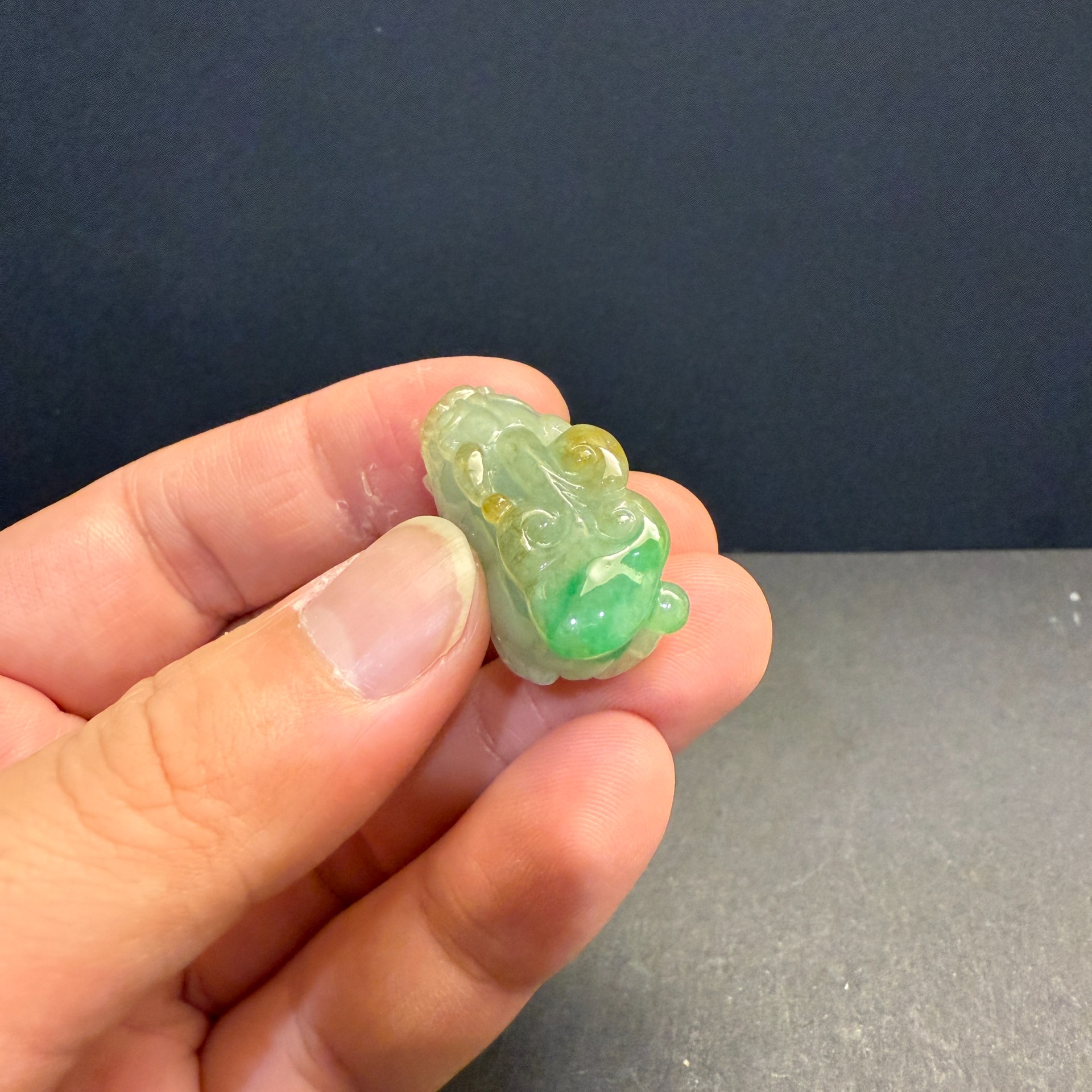 一體雕就,翠綠、蜜黃與冰白色澤自然交融,彷彿天地靈氣匯聚於此,成就這隻神態靈動的小貔貅。額前翠意盎然,象徵開運與守財之力;背部蜜黃潤澤,添一抹溫暖福氣。