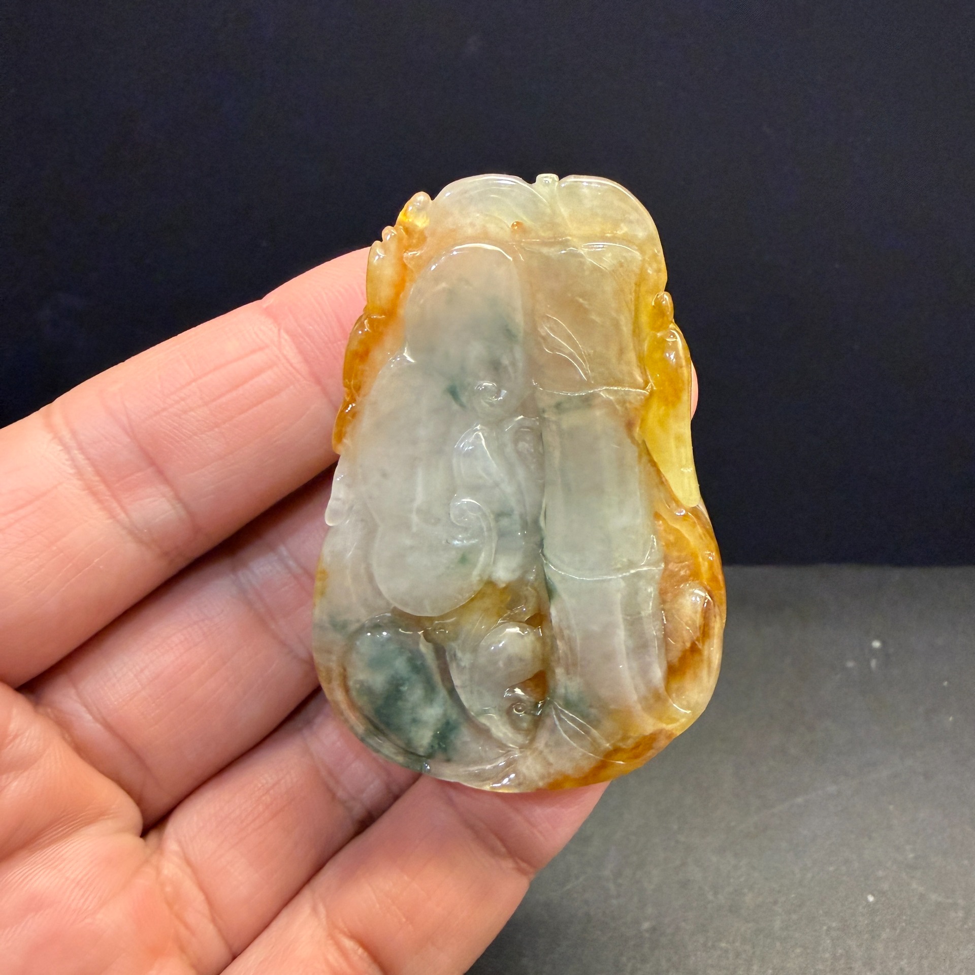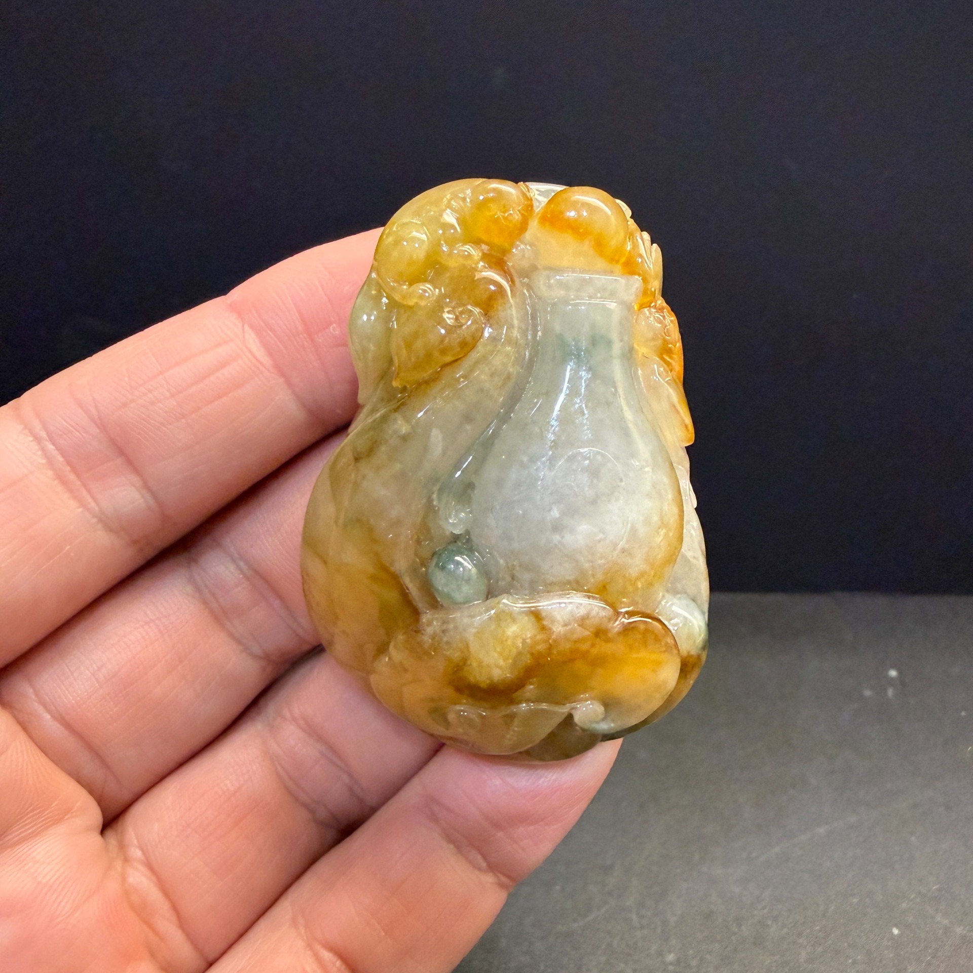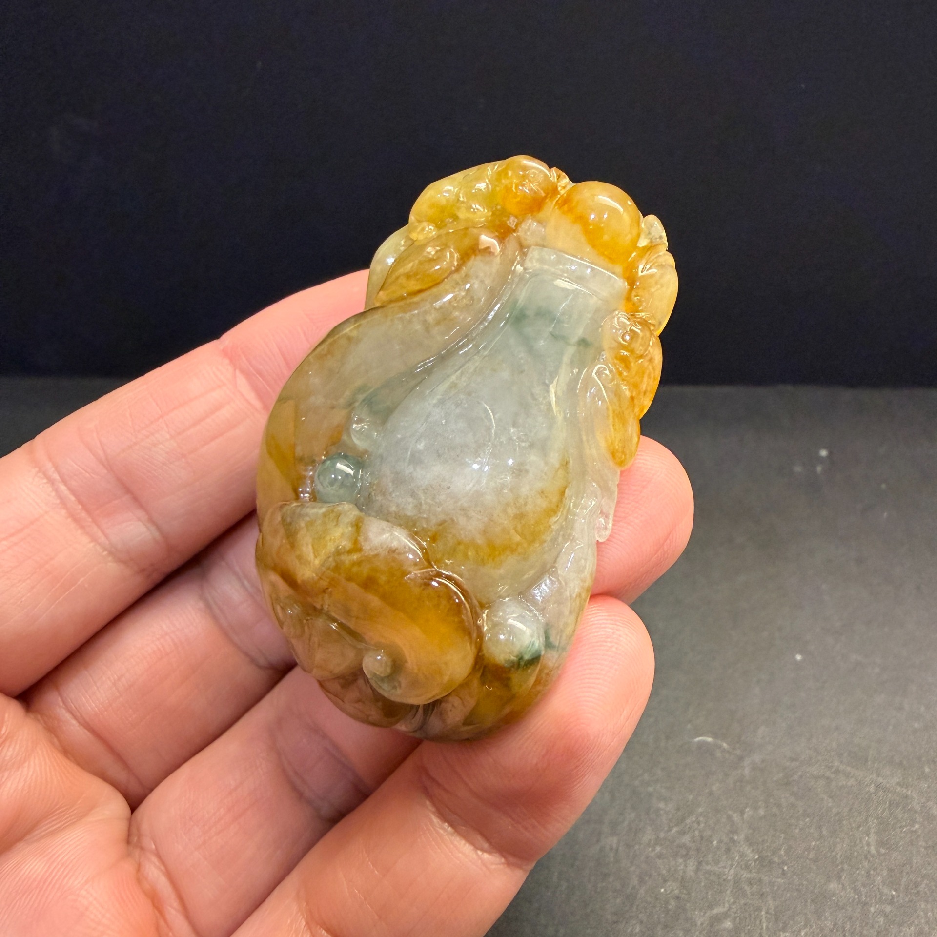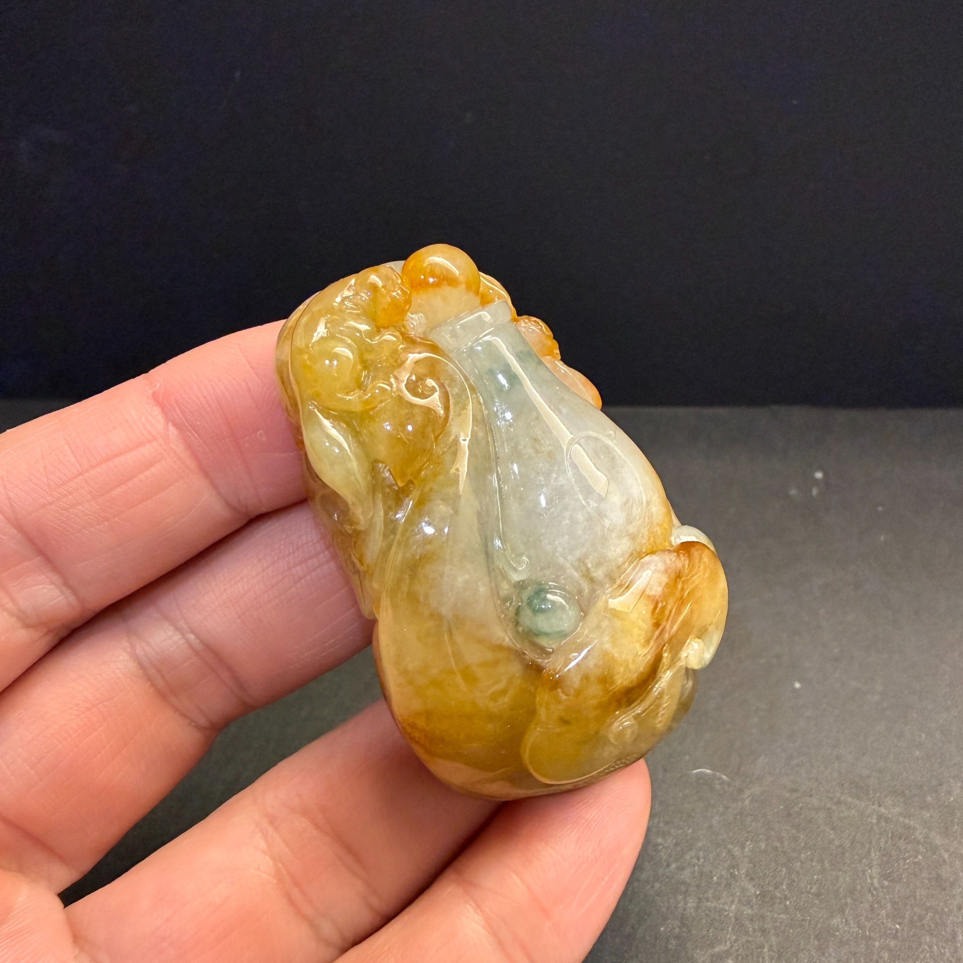 以巧色黃翡雕琢瑞獸,環抱寶瓶,寓意守住平安、聚財納福、不外漏。