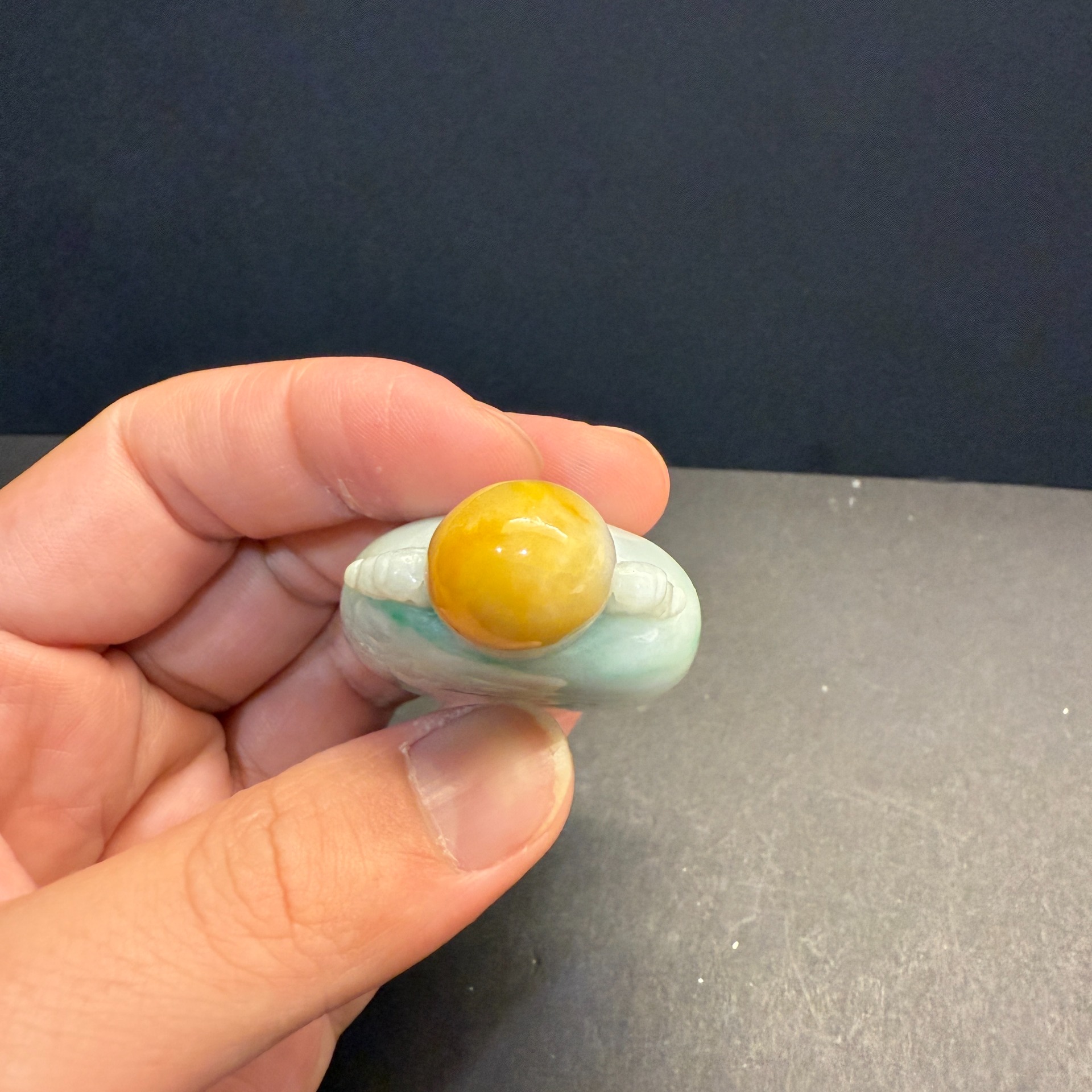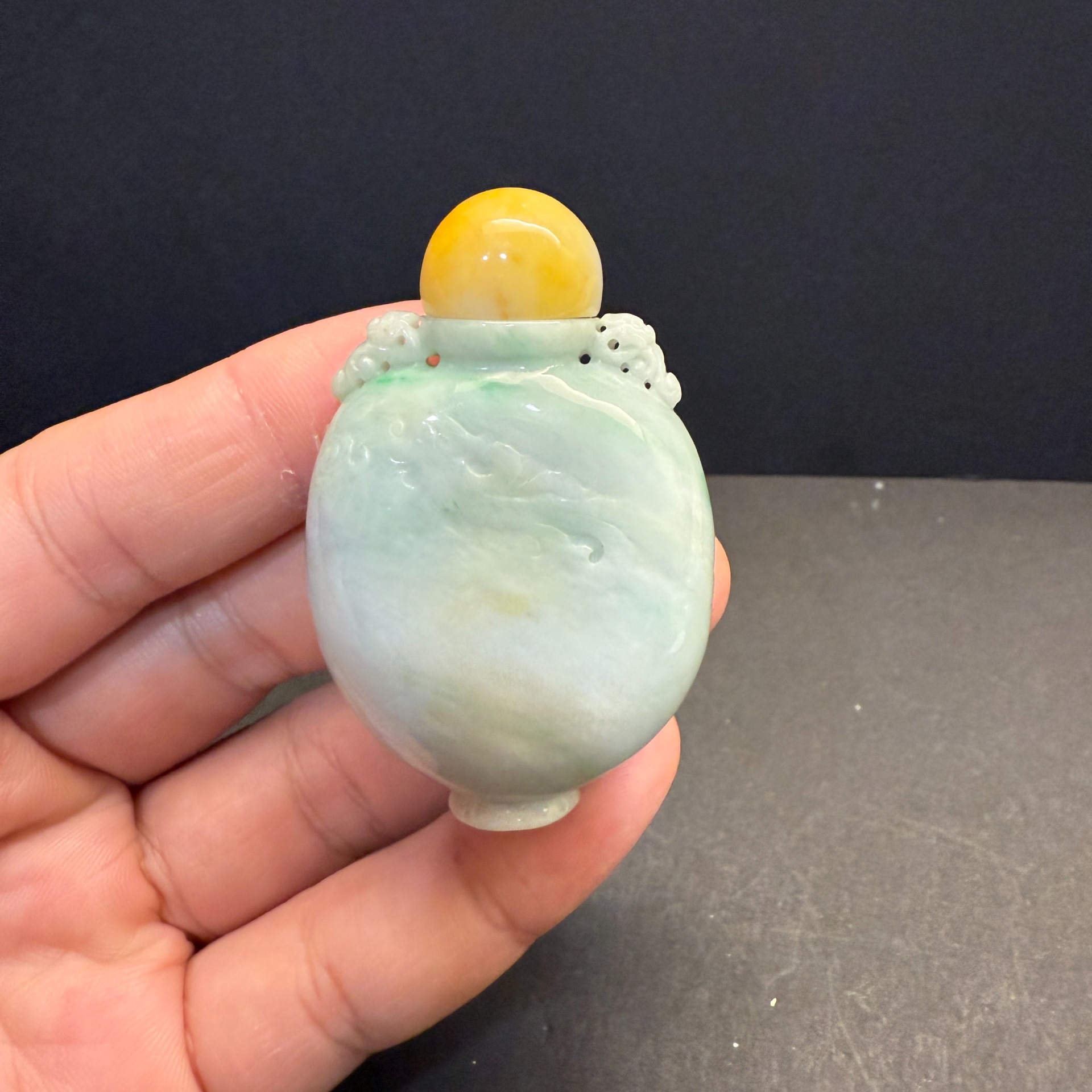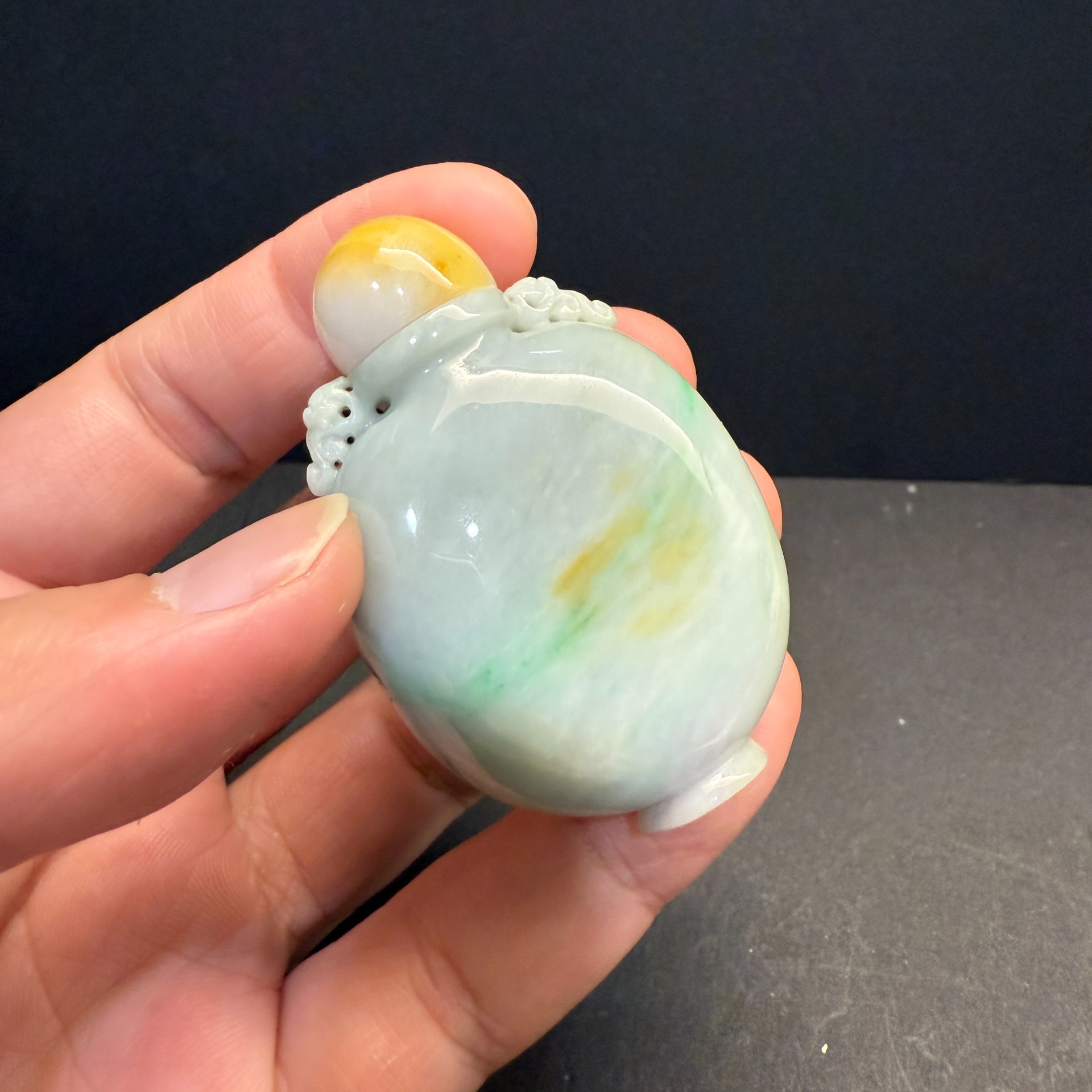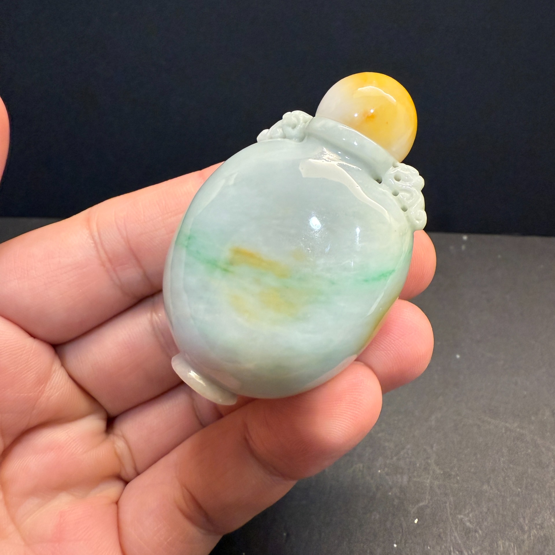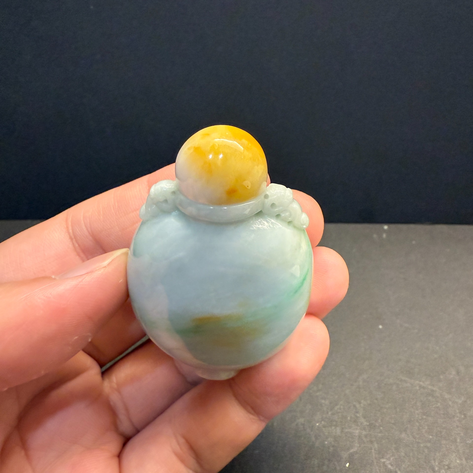 在淡雅如霧的翡翠本色中,輕輕浮現一抹翠綠與黃翡,宛如晨曦初露時山間的雲煙,靜靜流轉於瓶身。瓶蓋採用溫潤黃翡點綴,與瓶身相呼應,層次分明,如古人掌中把玩之器,亦可為案上清賞之珍。