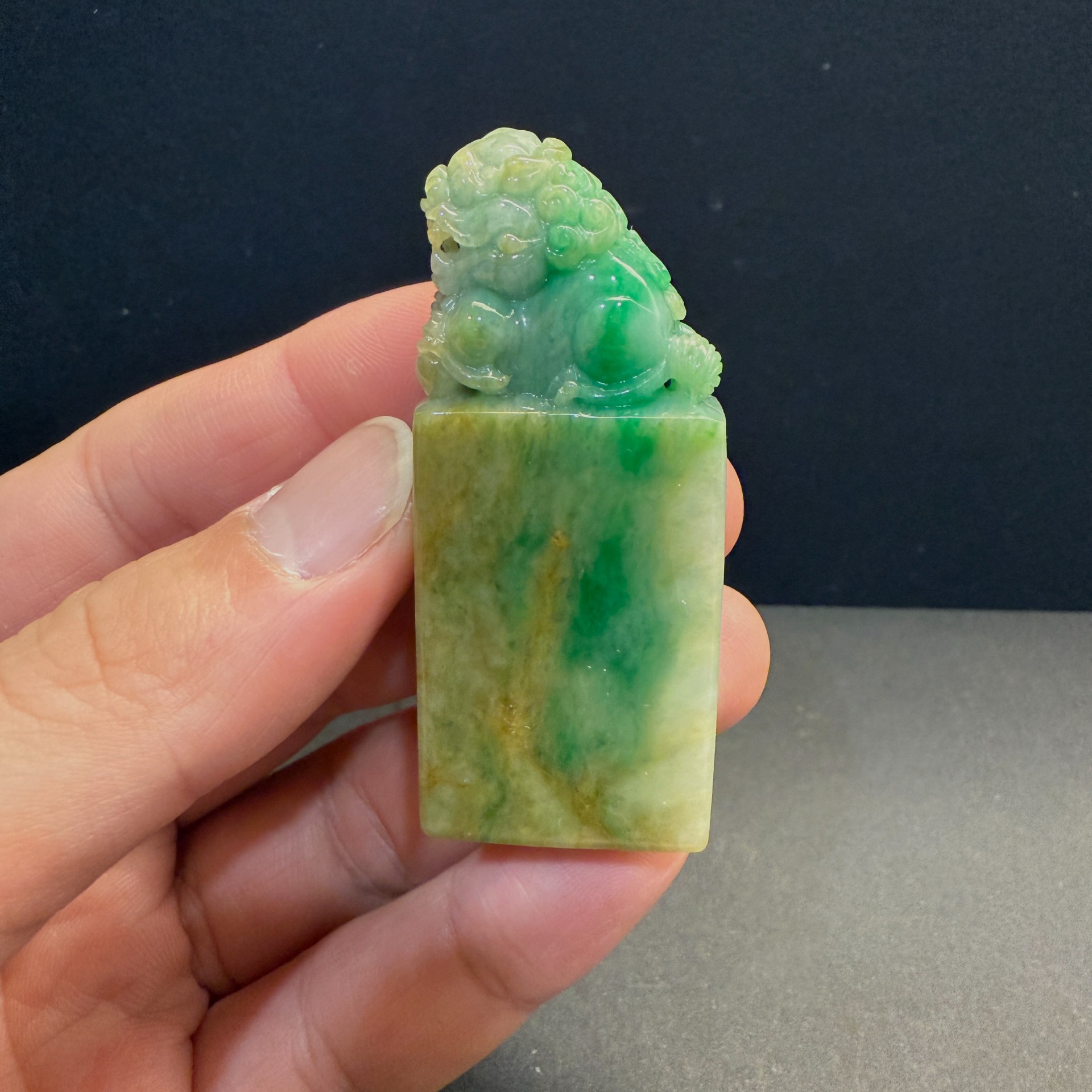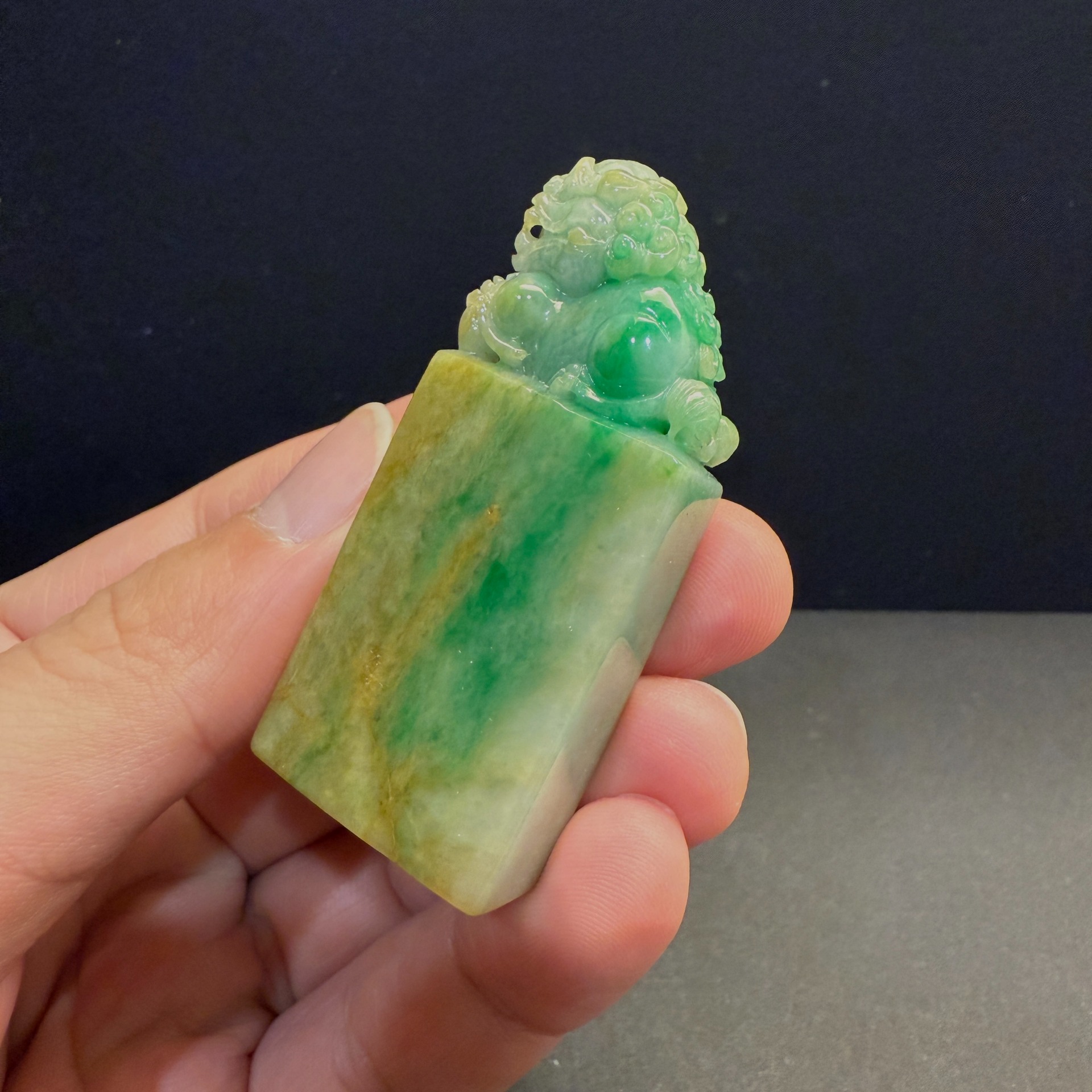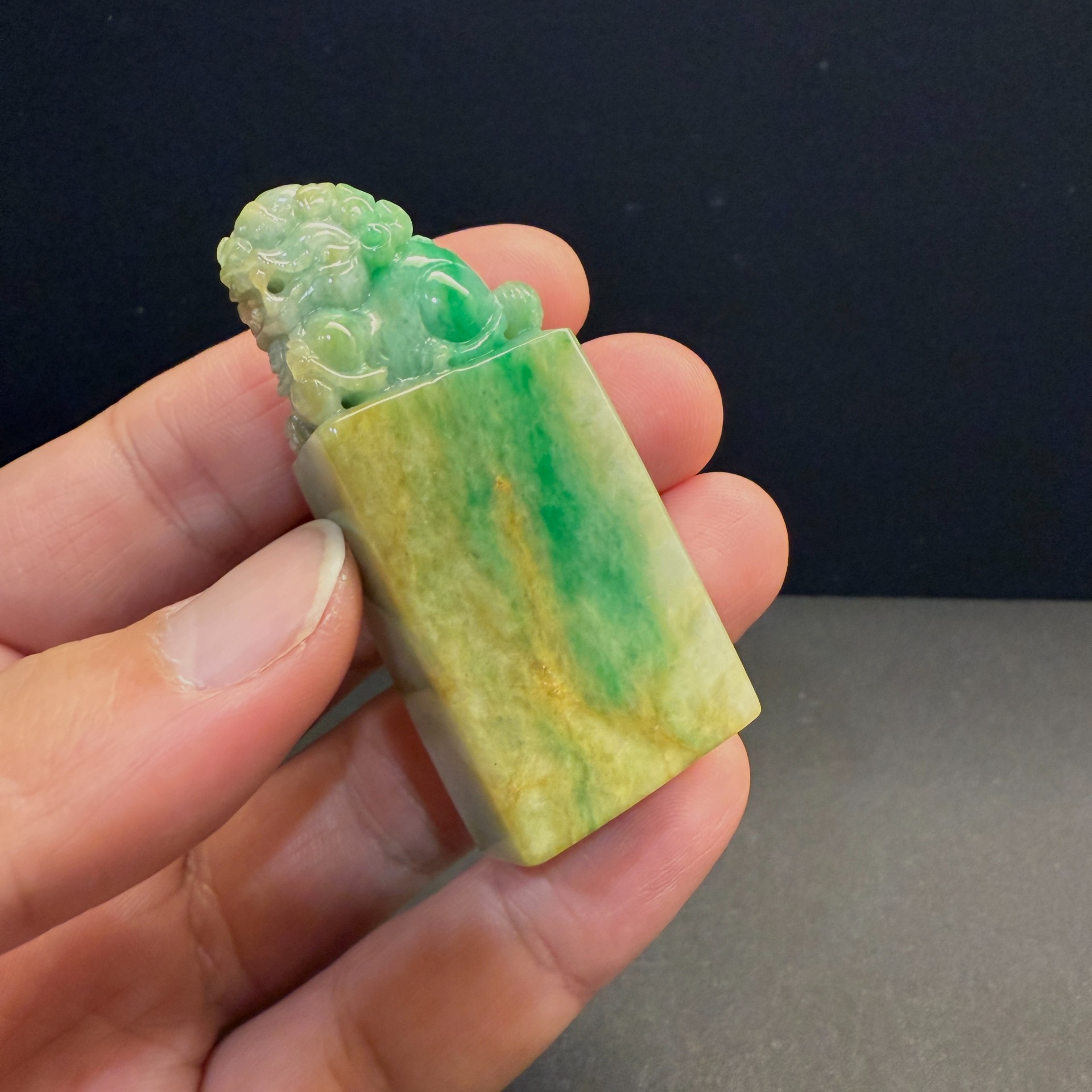瀚玉珠寶 天然老三彩獅子印章 寶獅戲球 老味道玉石印章 手工印章 黃加綠 精品印章 獅子印章