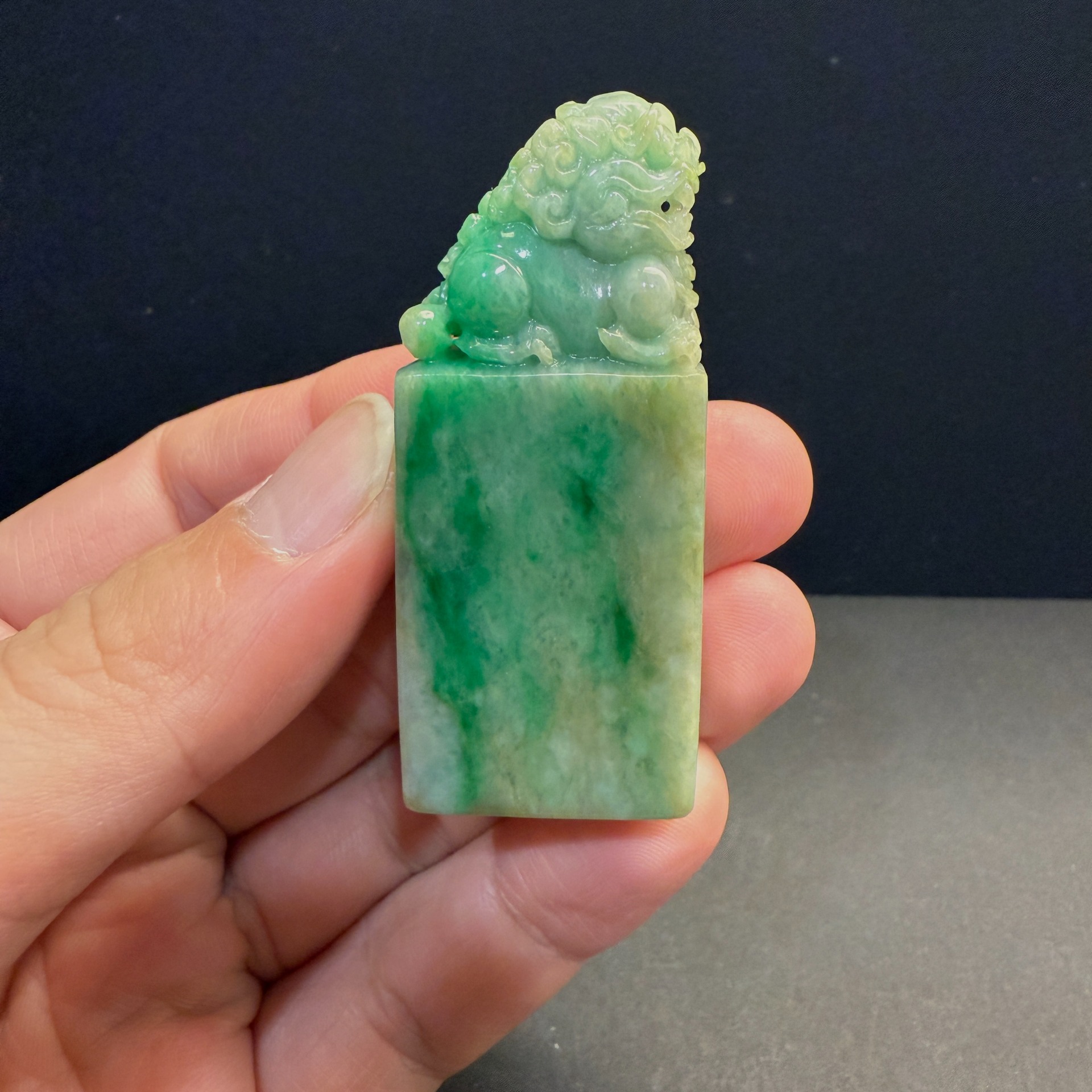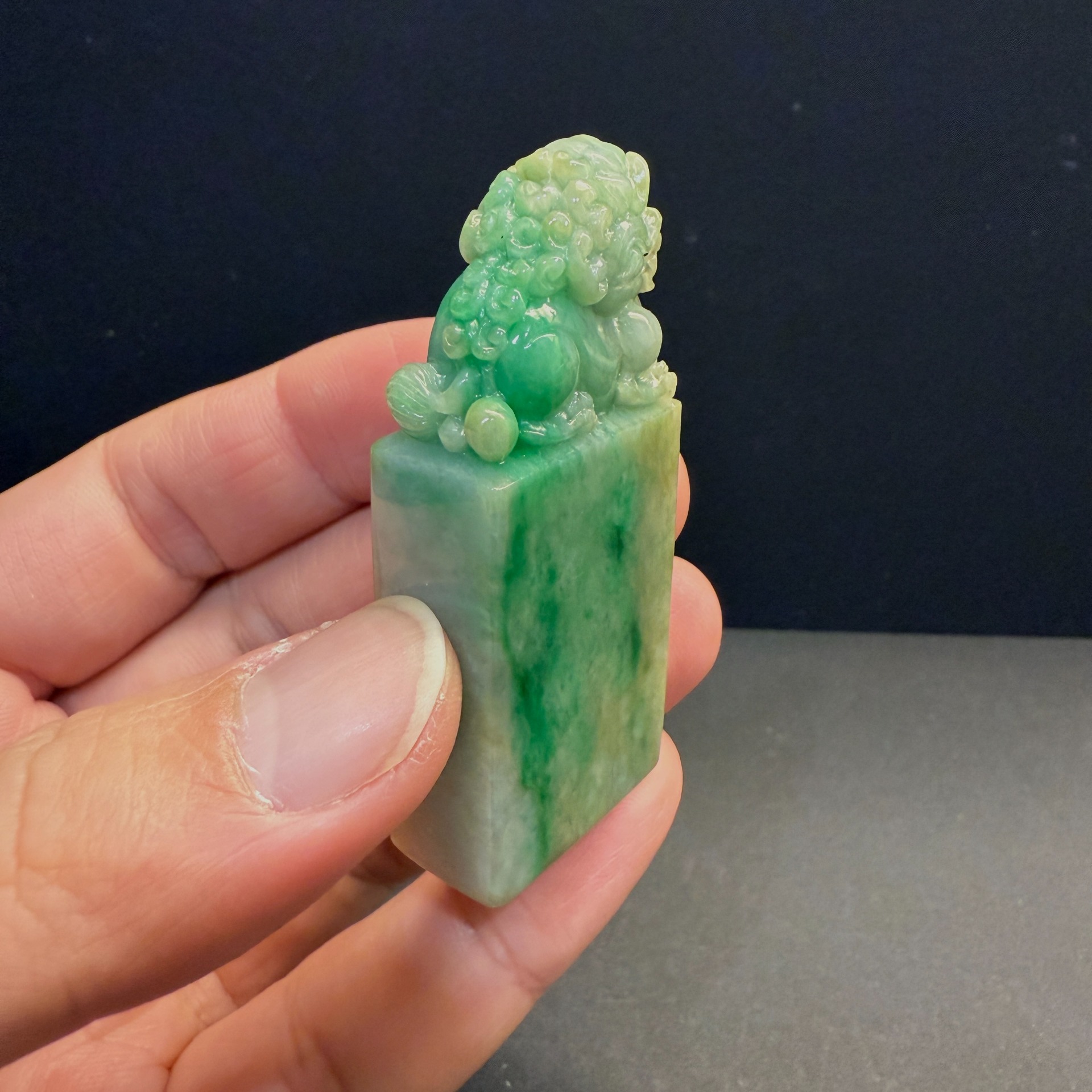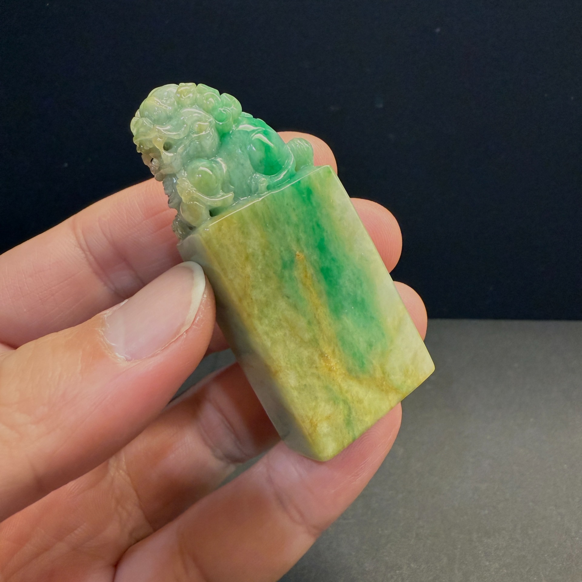 瀚玉珠寶 天然老三彩獅子印章 寶獅戲球 老味道玉石印章 手工印章 黃加綠 精品印章 獅子印章