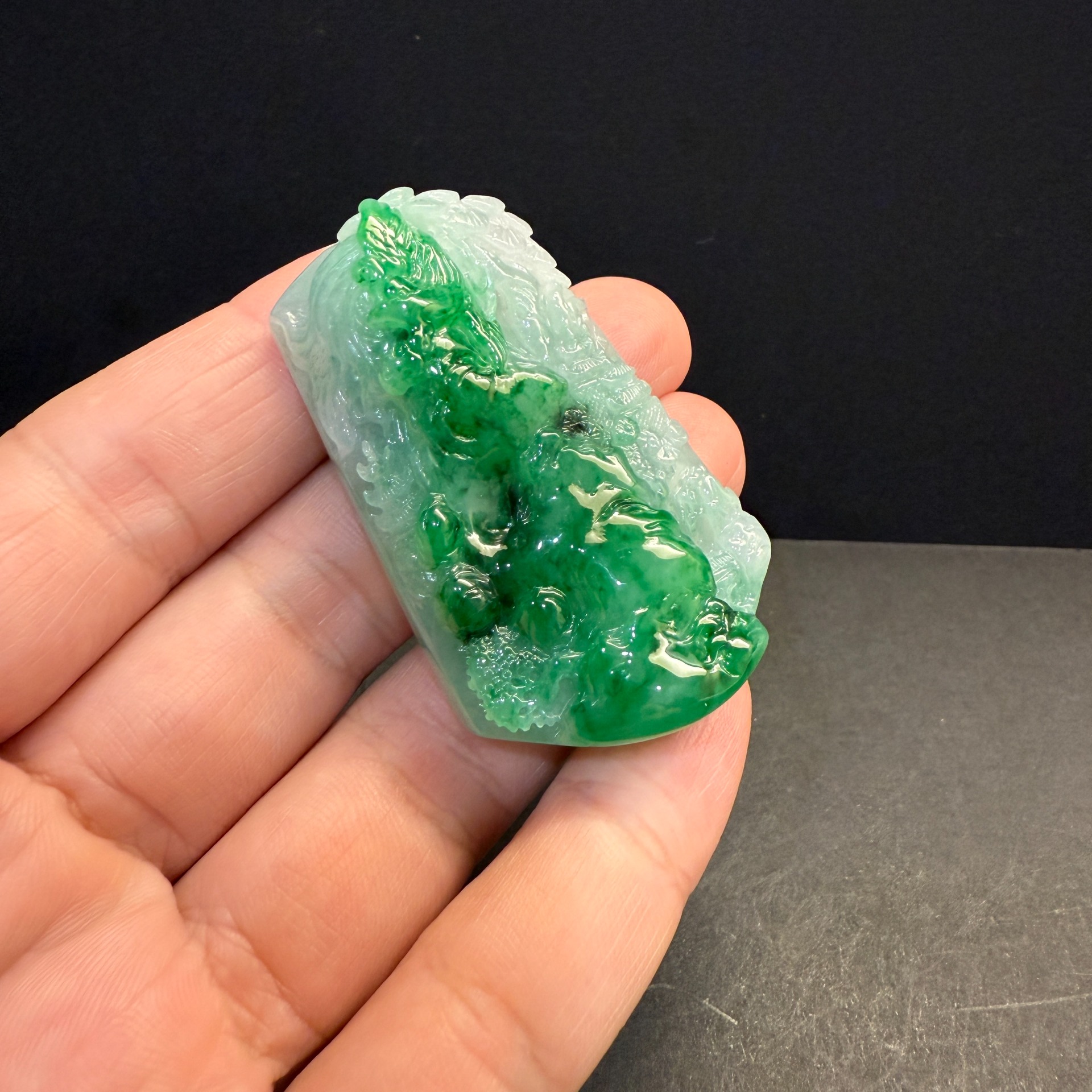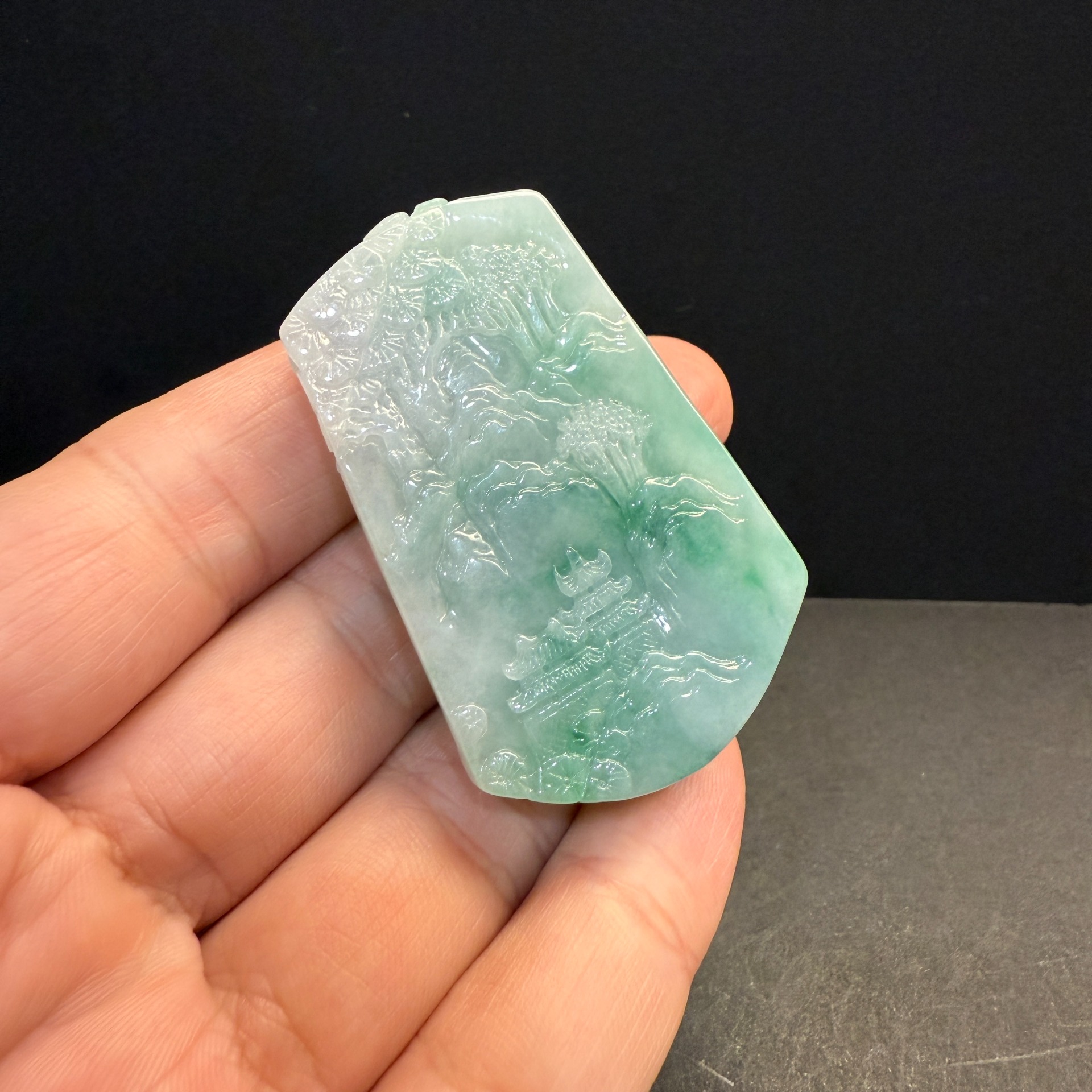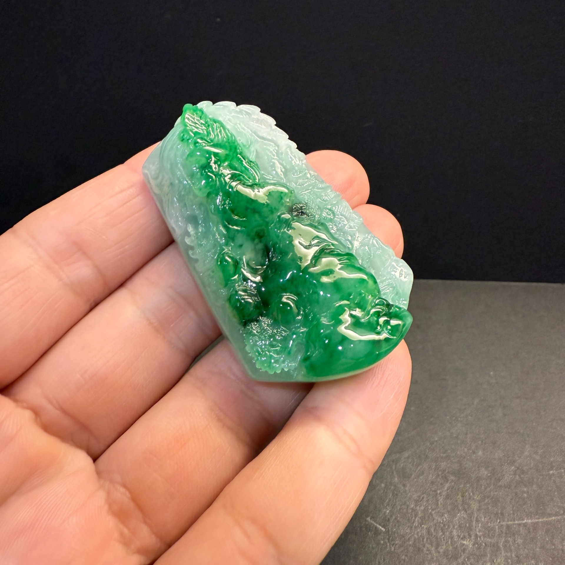瀚玉珠寶 天然A貨翡翠 翠意山水牌 天然濃陽綠 冰糯種 巧妙的展現了表面的綠色 吸睛搶眼俏色巧雕 緬甸玉山水牌中的極品尺寸:約54.6 * 33.6 * 13.1mm種水:冰糯種