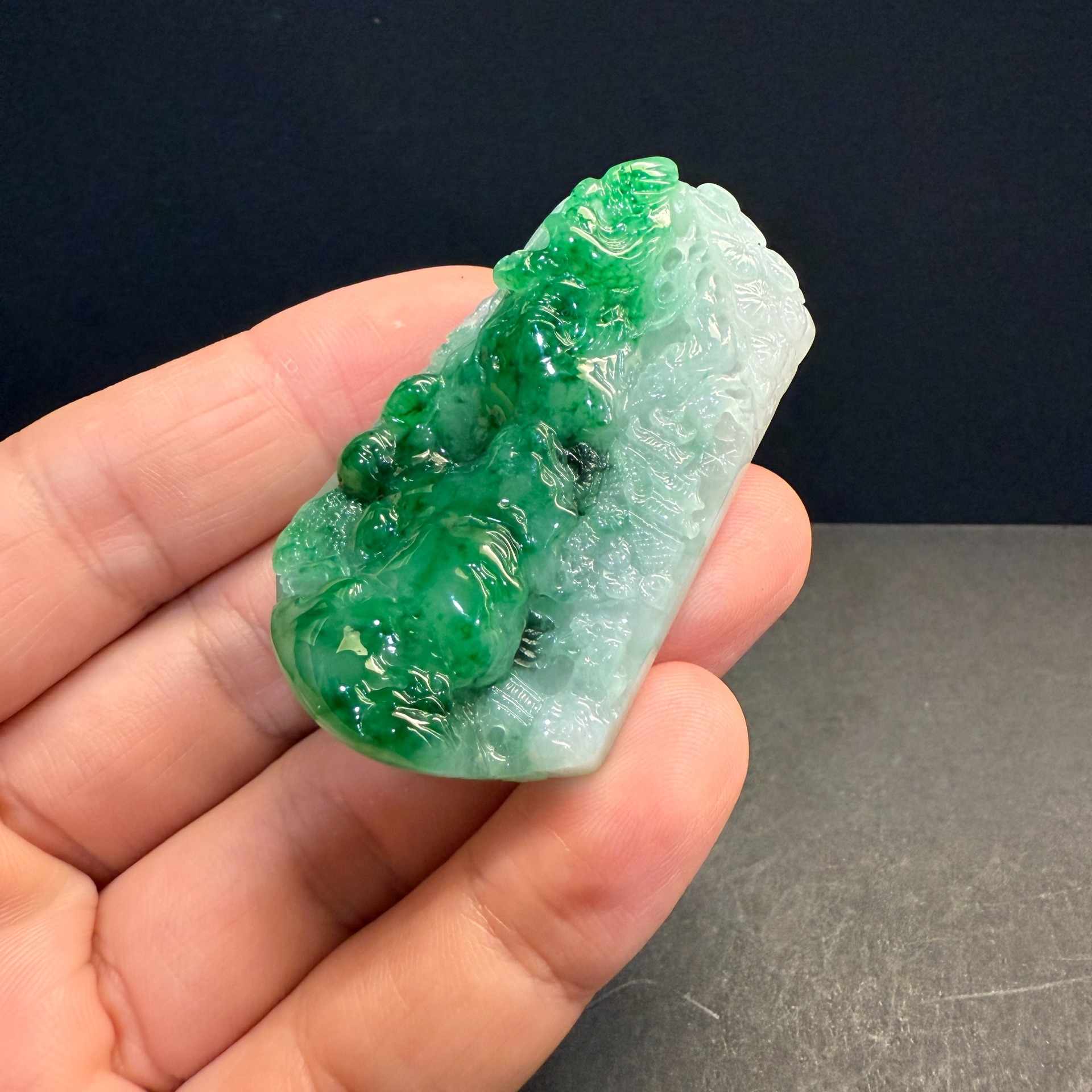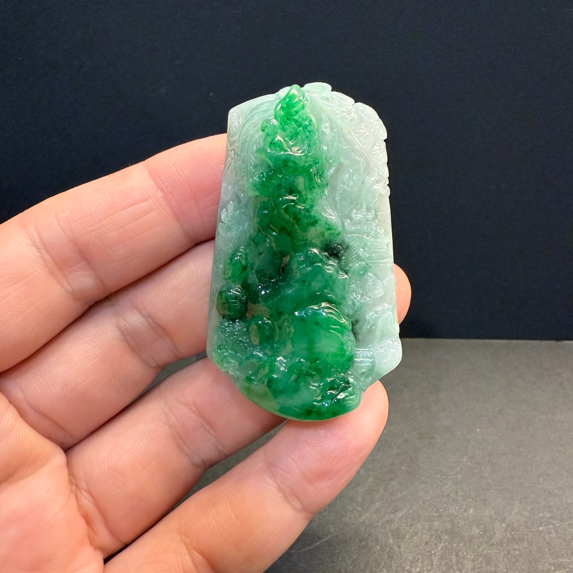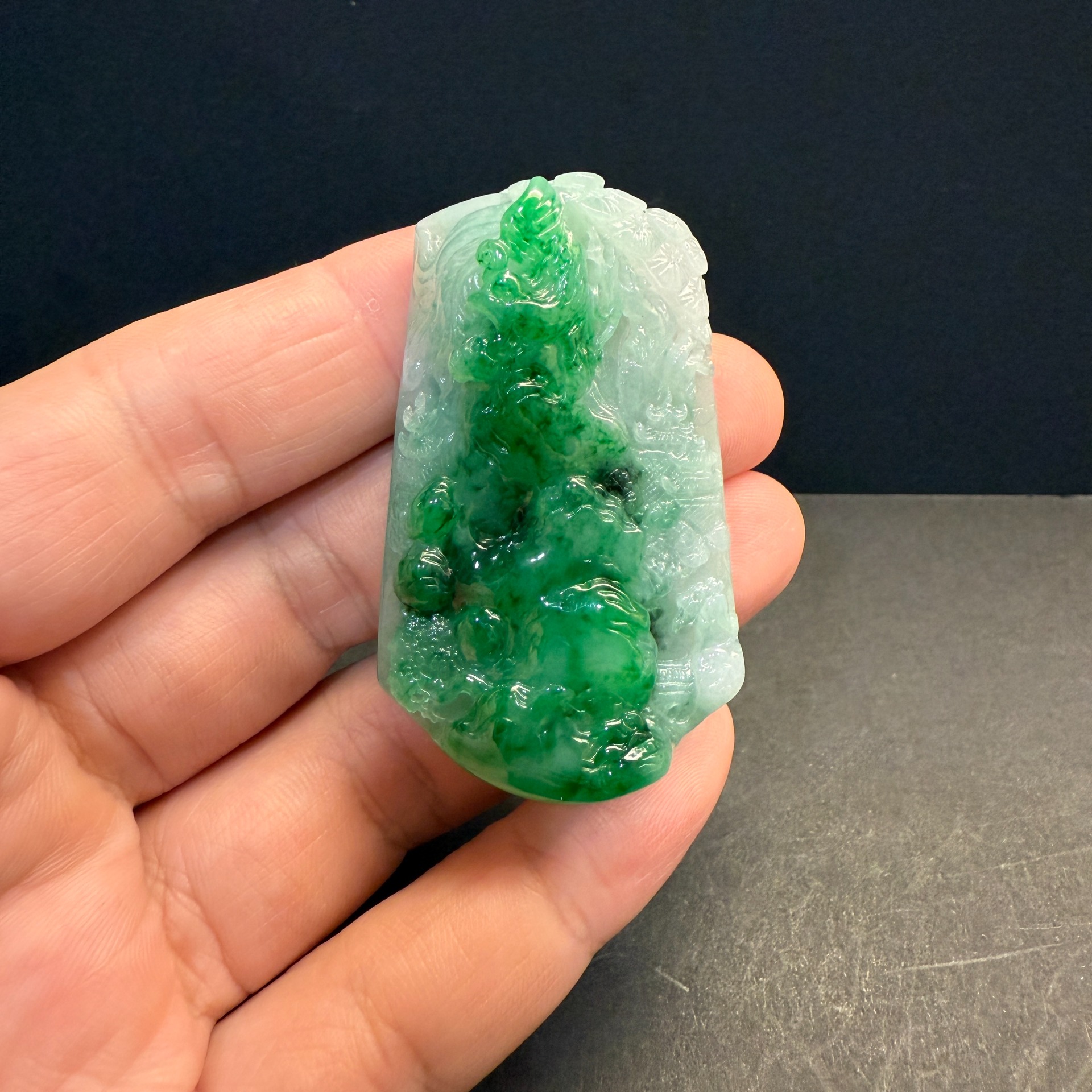 瀚玉珠寶 天然A貨翡翠 翠意山水牌 天然濃陽綠 冰糯種 巧妙的展現了表面的綠色 吸睛搶眼俏色巧雕 緬甸玉山水牌中的極品尺寸:約54.6 * 33.6 * 13.1mm種水:冰糯種